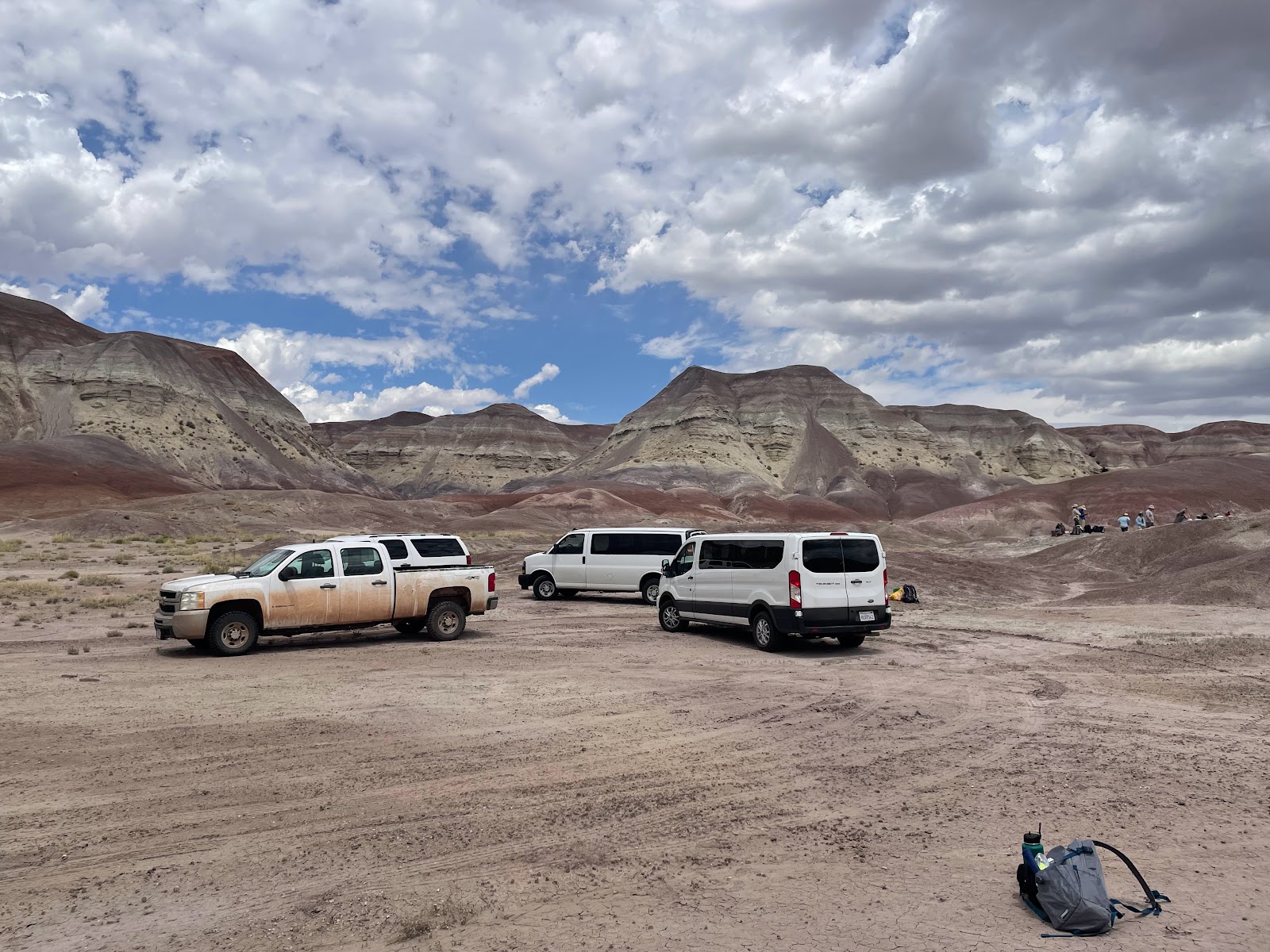 After a lunch stop at Chinde Point (with a great view of the Painted Desert), we headed back to Blue Mesa with park paleontologist Bill Parker. Bill took us to an area called the Dying Grounds, where we practiced prospecting for fossils – reading the landscape and looking for clues of fossil deposits. The Blue Mesa area is named for the blue and purple sandstone layers, indicating the presence of water. We hiked into the badlands to learn and practice how to find fossil beds.